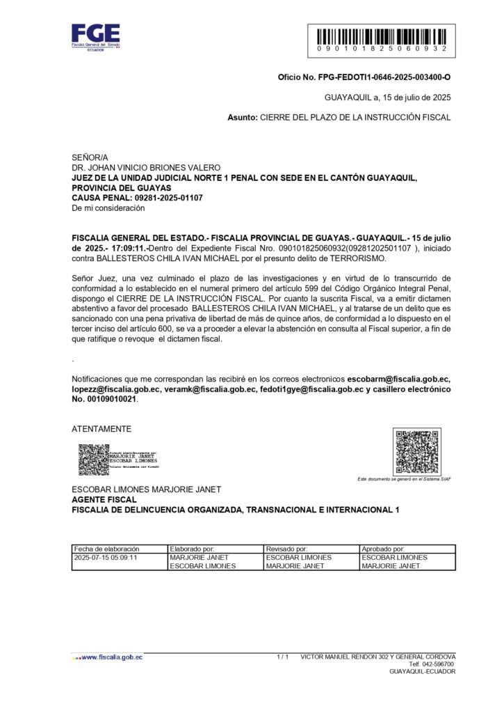 DOCUMENTO ENVIADO POR LA AGENTE FISCAL MARJORIE ESCOBAR LIMONES AL JUEZ JOHAN BRIONES VALERO EN EL QUE NOTIFICA EL CIERRE DE LA INSTRUCCIÓN FISCAL Y EL DICTAMEN ABSTENTIVO A FAVOR DE IVÁN B.