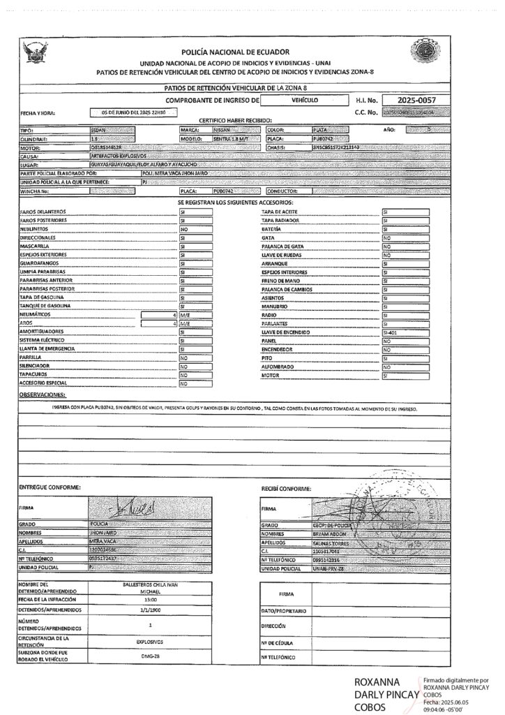 Las grabaciones de la empresa municipal Segura EP fueron claves para reconstruir el recorrido del vehículo que habría dejado el explosivo: un Nissan Sentra plomo de placas PUB-0742, registrado a nombre de Solón Antonio López Alcívar. Las imágenes muestran cómo uno de los ocupantes desciende del automóvil y coloca el artefacto.