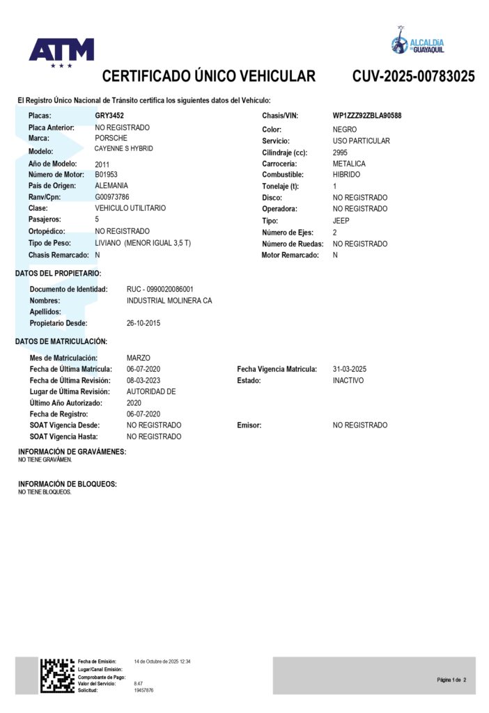 CRETIFICADO ÚNICO QUE CONFIRMA QUE EL PORSCHE CAYENNE NEGRO, DE PLACAS GRY-3452, ESTÁ REGISTRADO A NOMBRE DE INDUSTRIAL MOLINERAS C.A.