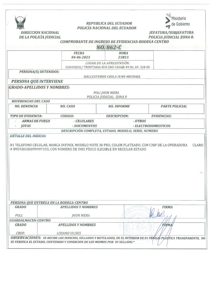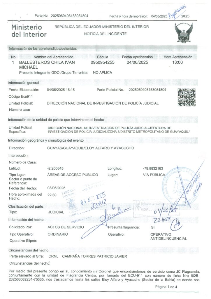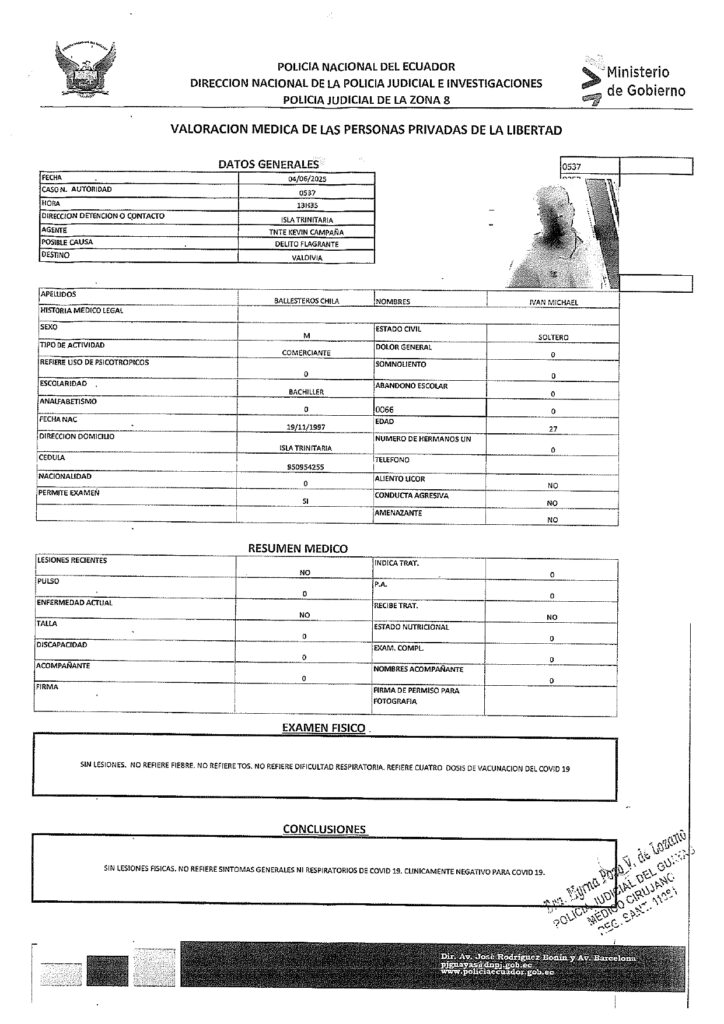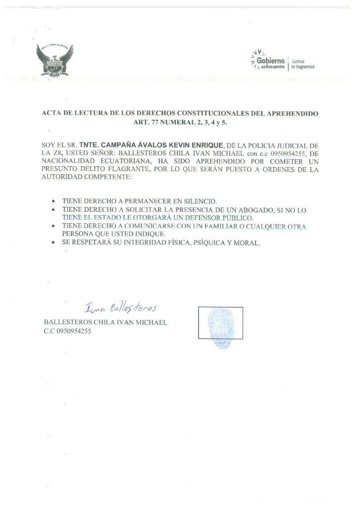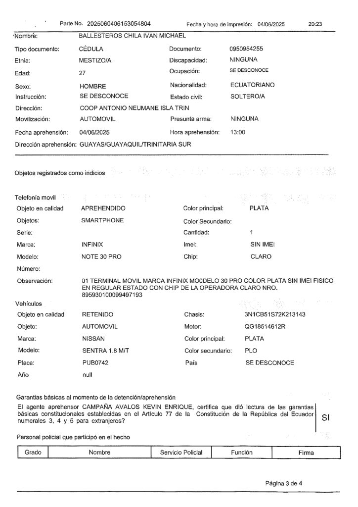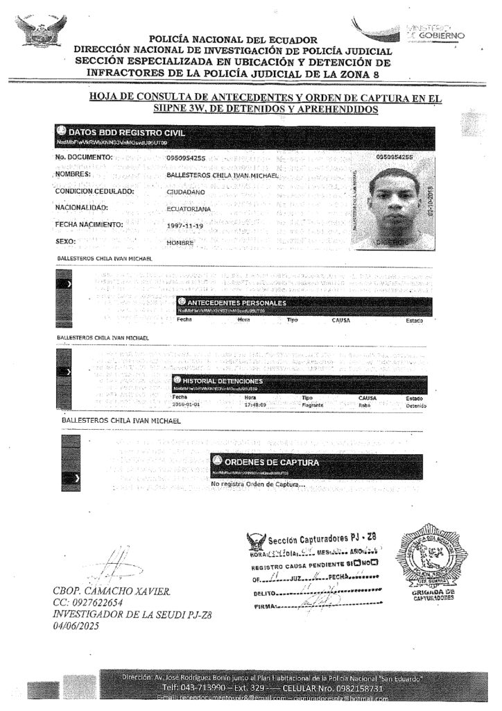 A través del sistema de videovigilancia, las autoridades rastrearon al vehículo hasta una casa en la cooperativa Antonio Neumane, en la Isla Trinitaria. Al día siguiente, el 4 de junio, un grupo de militares encapuchados y policías irrumpió en el inmueble y detuvo a Iván Michel Ballesteros Chilla, quien tenía antecedentes por robo. Sin embargo, fue liberado apenas diez días después, luego de un dictamen abstentivo emitido por la fiscal Marjorie Escobar Limones, con el respaldo del fiscal provincial Washington Astudillo.