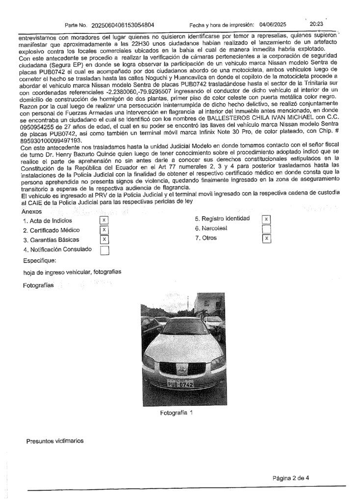 A CONTINUACIÓN EL PARTE POLICIAL QUE CONFIRMA QUE A IVÁN B. LE ENCONTRARON PRUEBAS QUE LO VINCULAN CON EL NISSAN SENTRA PLOMO DE PLACAS PUB-0742 EL CUAL FUE UTILIZADO PARA COLOCAR EL EXPLOSIVO EN LA BAHÍA.