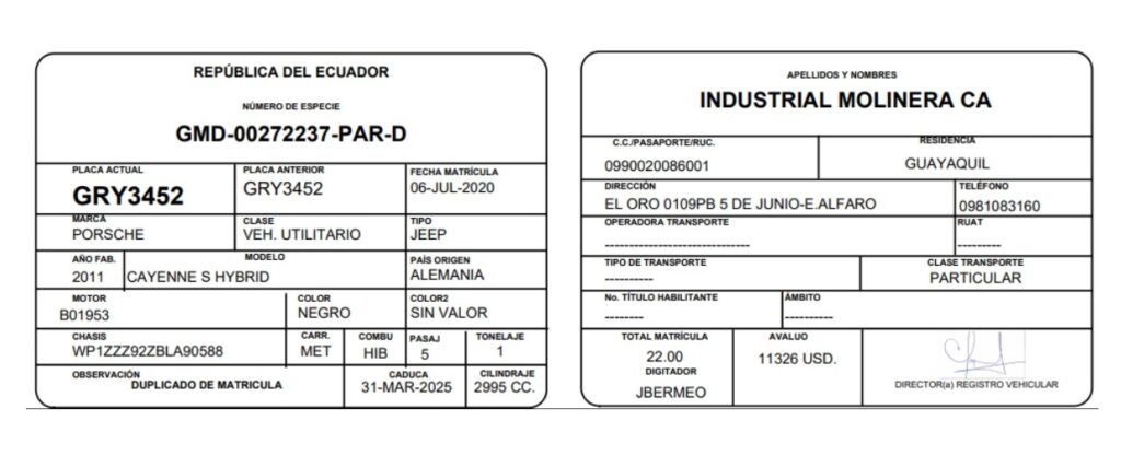 MATRICULA DEL PORSCHE CAYENNE NEGRO, DE PLACAS GRY-3452, REGISTRADO A NOMBRE DE INDUSTRIAL MOLINERAS C.A.